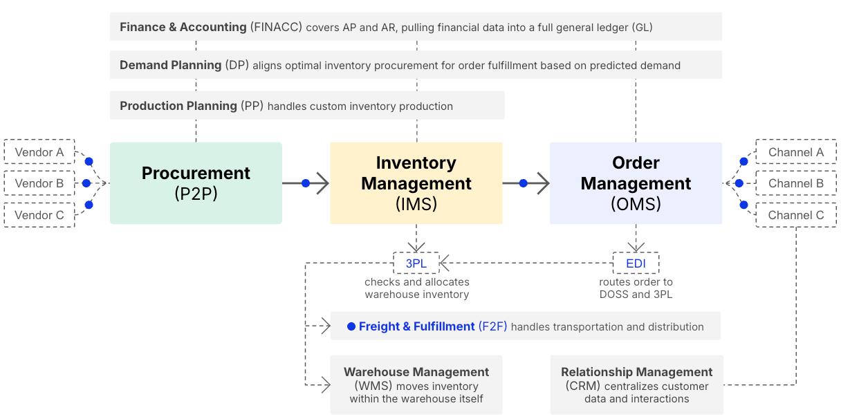 That conversation shapes how we configure P2P, IMS, and OMS for their specific needs. It also reveals which supporting modules—like demand planning, warehouse management, or CRM—will help close gaps, automate repetitive work, and give their teams more time to focus on strategic growth. Below is a broad visualization of how these additional modules may map around P2P, IMS, and OMS. In practice, most customers will use a subset of these capabilities: