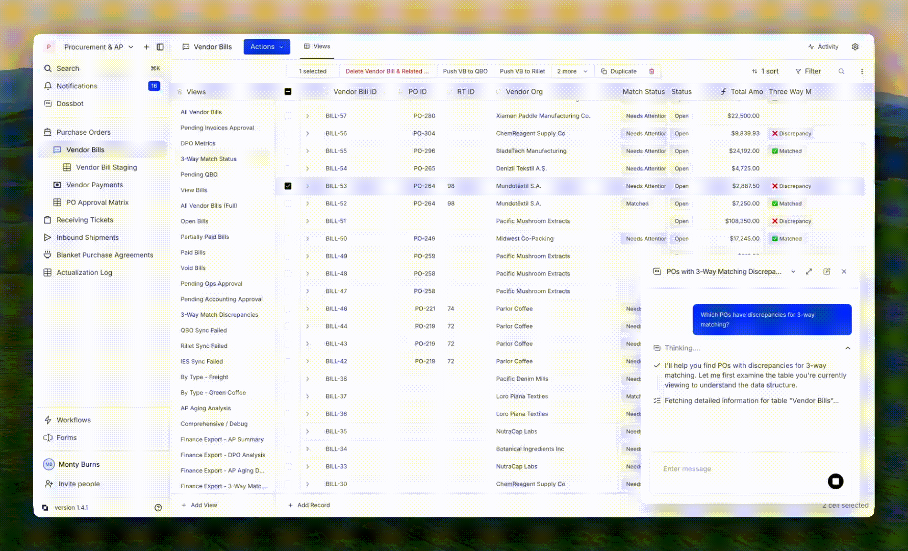 FINACC is built on Unified Master Data (UMD) , which means every transaction in the operations layer (procurement, inventory, orders, fulfillment) shares a consistent data structure that maps cleanly to your chart of accounts. When a PO is received, the journal entry is generated automatically. When an invoice arrives, it gets matched against the PO and item receipt automatically. Sales orders, bills, inventory movements, and invoices all sync to your GL as they close, not in a batch at month-end.