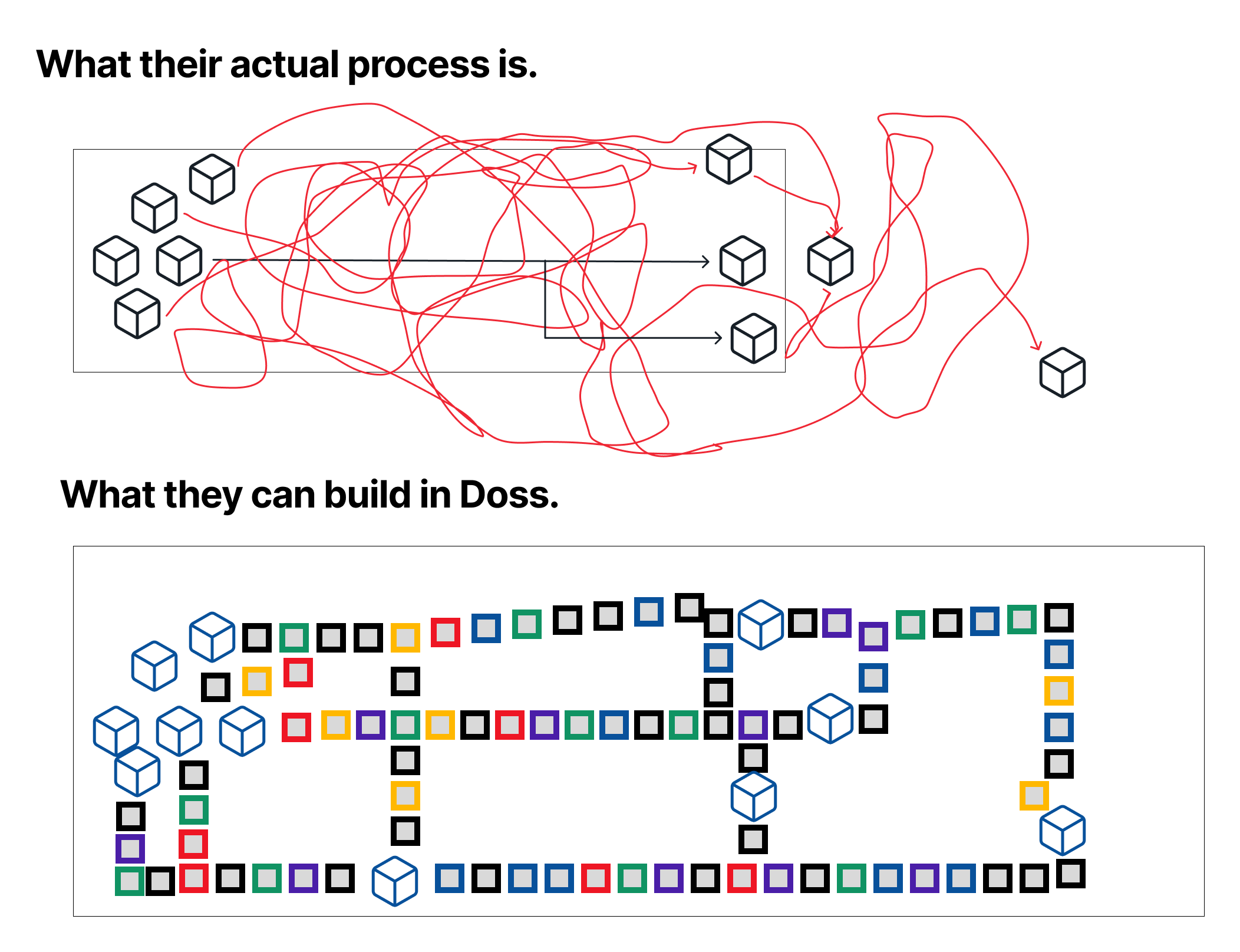 - DOSS Data Model Abstraction Layer (DDMAL). I don’t know how to come up with a better name for this but basically the idea is that we need to make the data model of our product (DOSS Data Model AKA the “DDM”) something that users can interact with in a legible manner. Many products have started exposing their “data graph” or “fields and properties” in a visual editor of sorts. We’re going to do the same thing but within a few twists that make it better (field linking, workflow ingress / egress, process visualization, and more listed later on).
