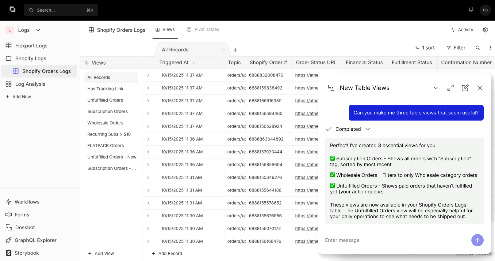 We started with a Shopify order logs table containing 200,000+ transaction records, asking dossbot to suggest a few useful table views.