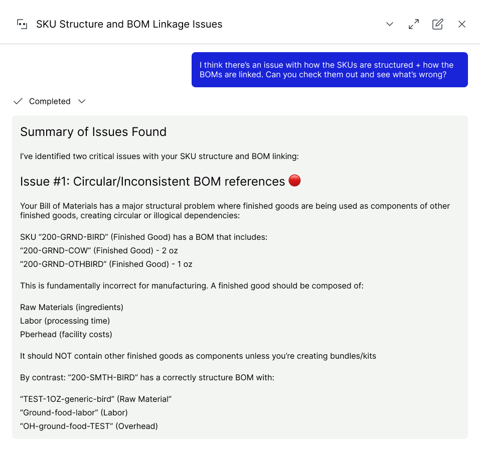When prompted to find the issue, dossbot queried table structures, examined bill-of-materials (BOM) relationships, and came back with a diagnosis: circular references. Some SKUs were self-referencing, where finished goods were listed as their own raw materials.