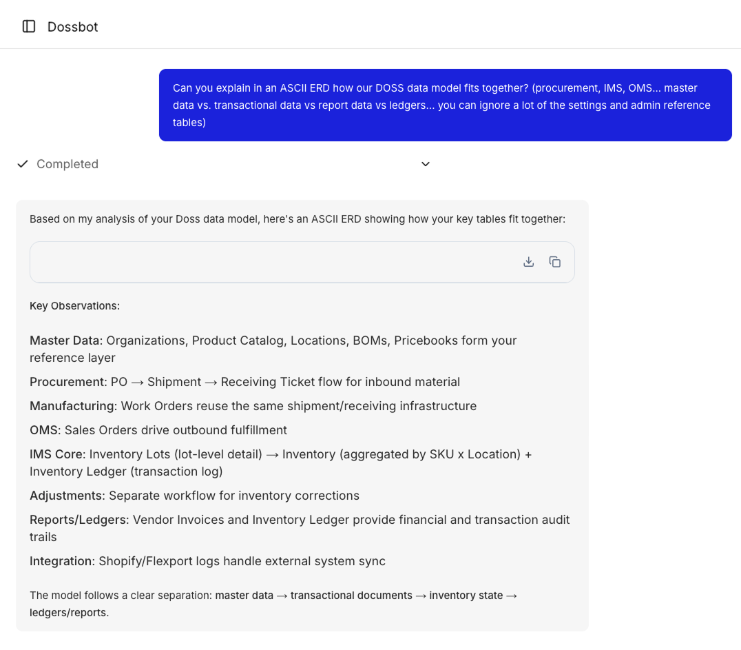 Dossbot analyzed every table, relationship, and connection. The result was a complete ASCII ERD showing how products connect to work orders, inventory, purchase orders, and receipts.