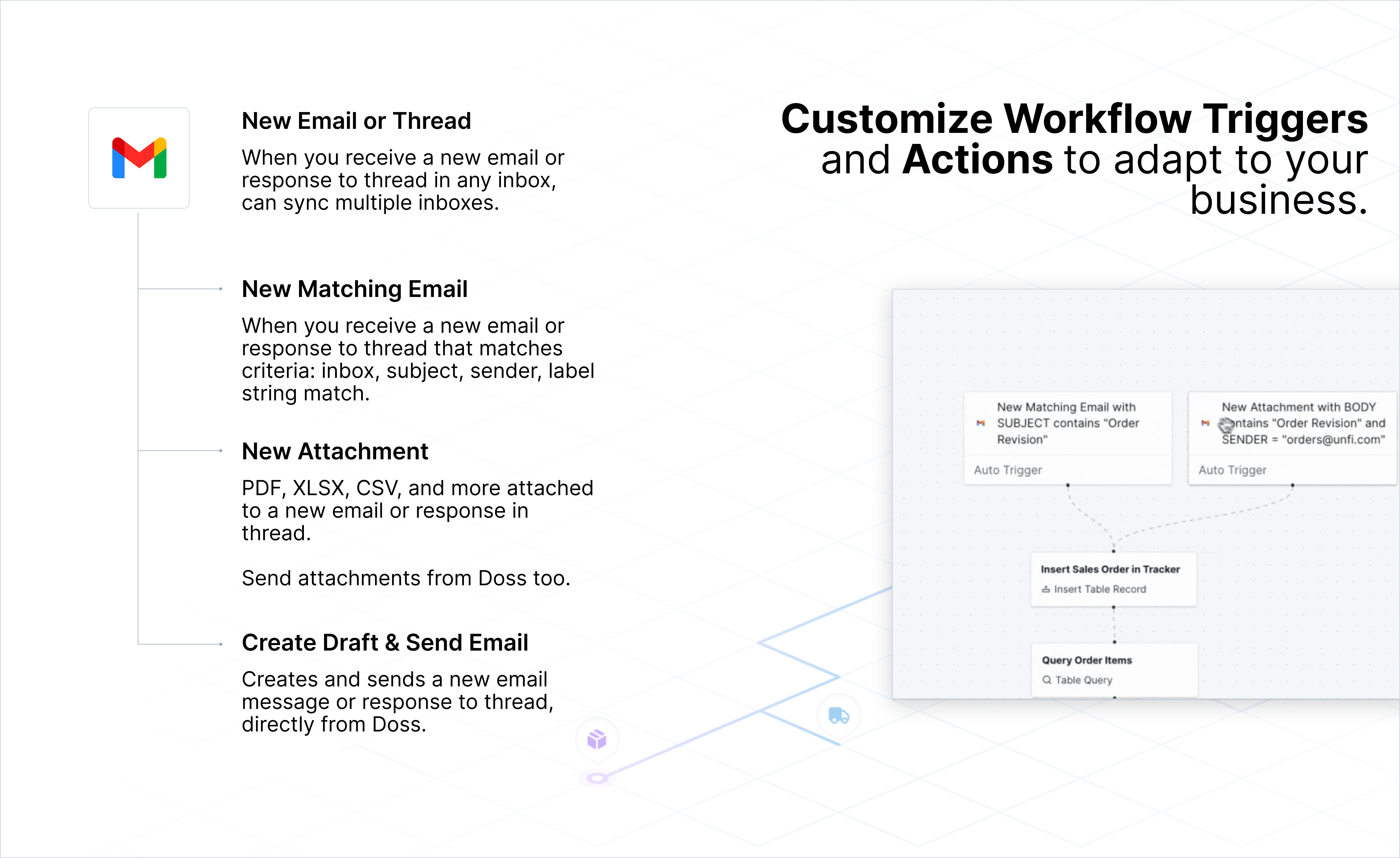 Not only can you trigger DOSS Workflows when you receive an email of any kind, we've provided all the tools you need to enable fully-automated order processing. Filter by senders, match message and subject content, even grab the attachment content and place it directly into your records.