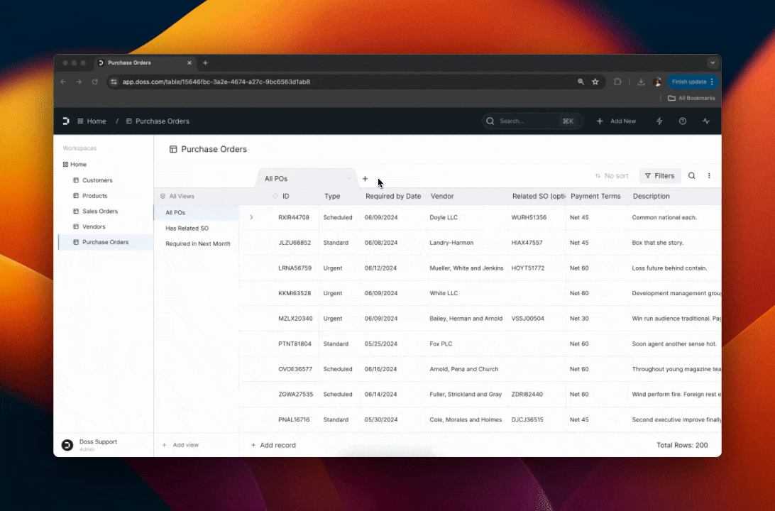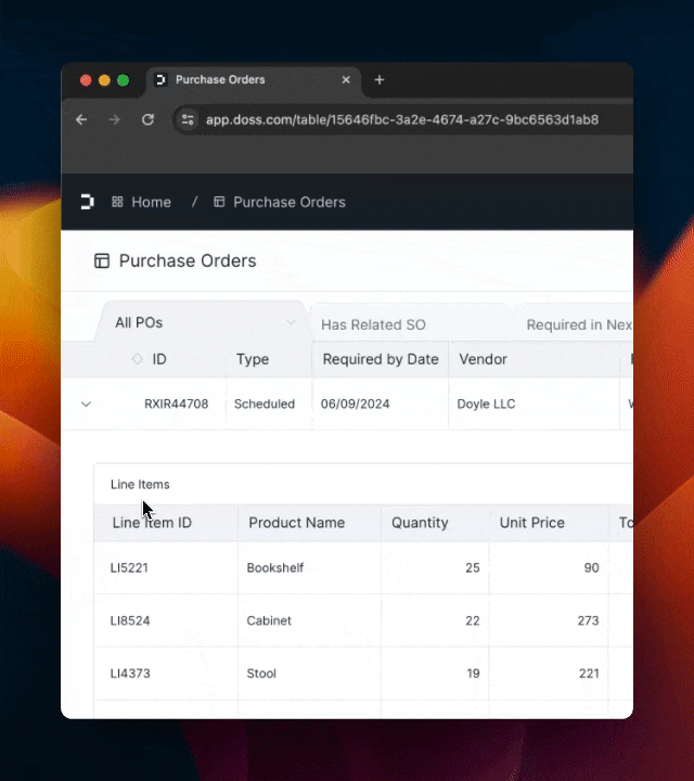 Tables and Workspace Navigation got a massive upgrade in DOSS 2.0. Whether you have a few products or tens of thousands of purchase orders, you can view and manage them in one seamless view or split them out between many customized views. Drill down with filters and get the bottom of your analysis with a powerful formula editor.