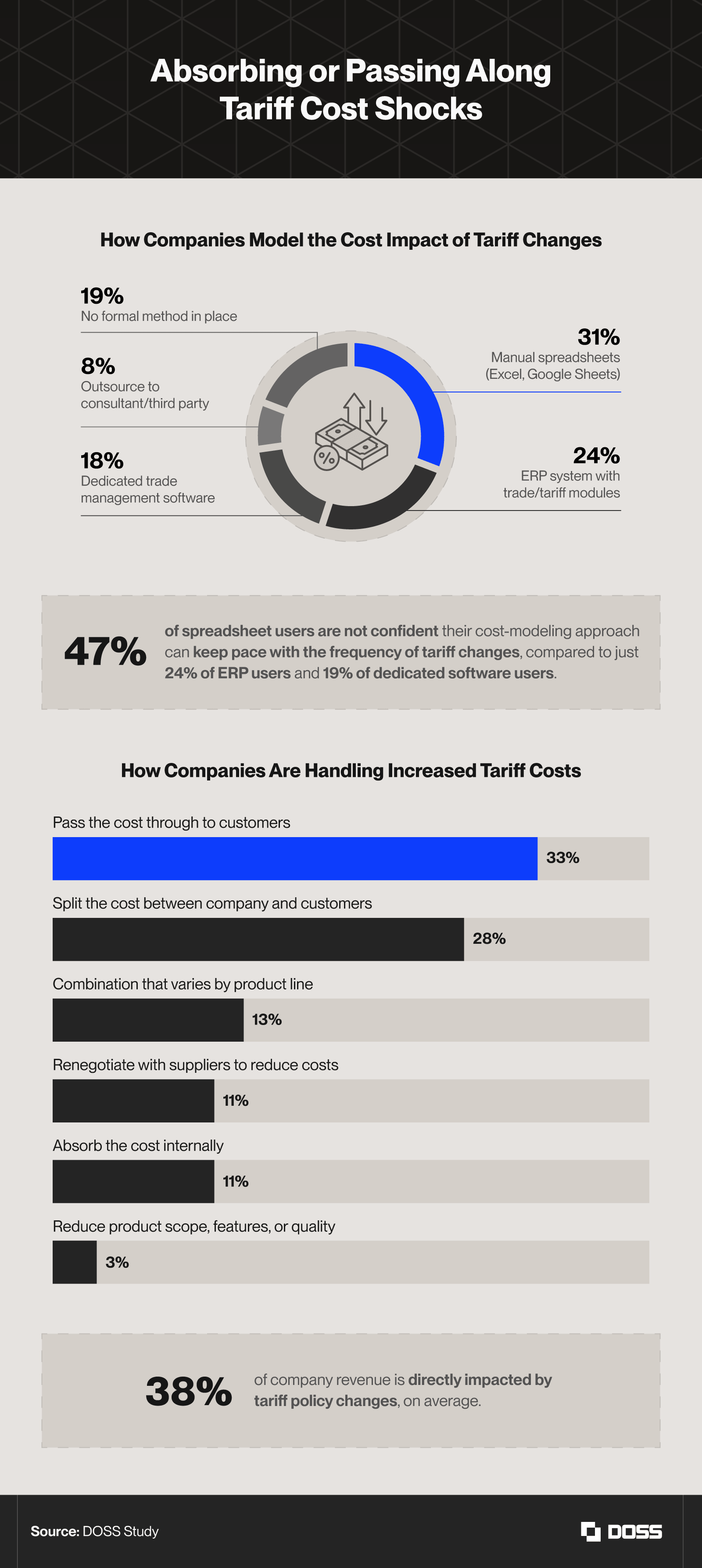 - 31% of decision-makers say their companies rely on manual spreadsheets to model tariff costs. By comparison, 24% use ERP systems with trade modules, 18% use dedicated trade management software, 8% outsource modeling to a third party, and 19% report having no formal method in place.
