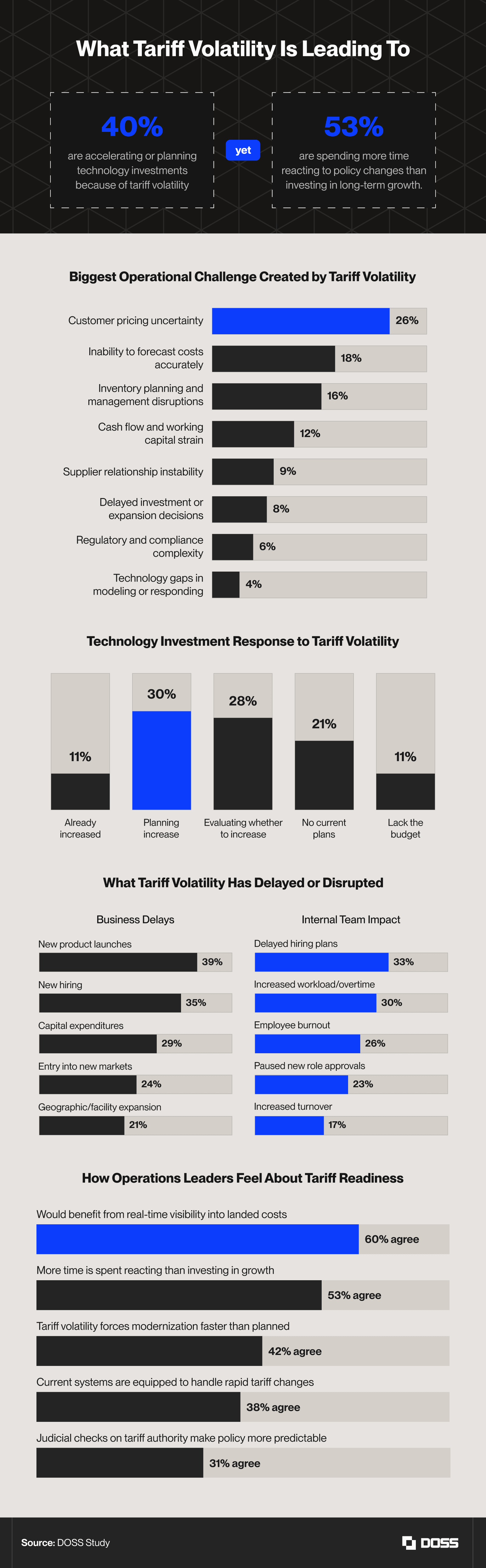 - 53% of decision-makers say their companies are spending more time reacting to trade policy changes than investing in long-term growth. At the same time, 40% report accelerating or planning technology investments in response to tariff volatility.